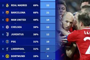 欧冠1/4决赛参赛次数榜: