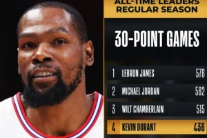 据统计,这是杜兰特生涯第436场单场30+,超越卡尔·马龙,上升至NBA历史第四位,仅次于詹姆斯、乔丹和张伯伦。