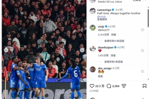 维尼修斯庆祝进球时疑似遭到种族歧视,皇马中场卡马文加社媒晒出球员们与维尼修斯的合照,配文:“中场休息,永远与你同在,兄弟,维尼修斯。”