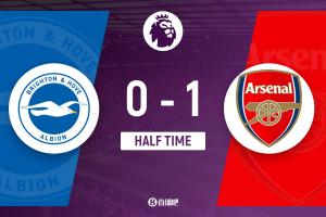 上半场补时3分钟。半场战罢,布莱顿0-1阿森纳。